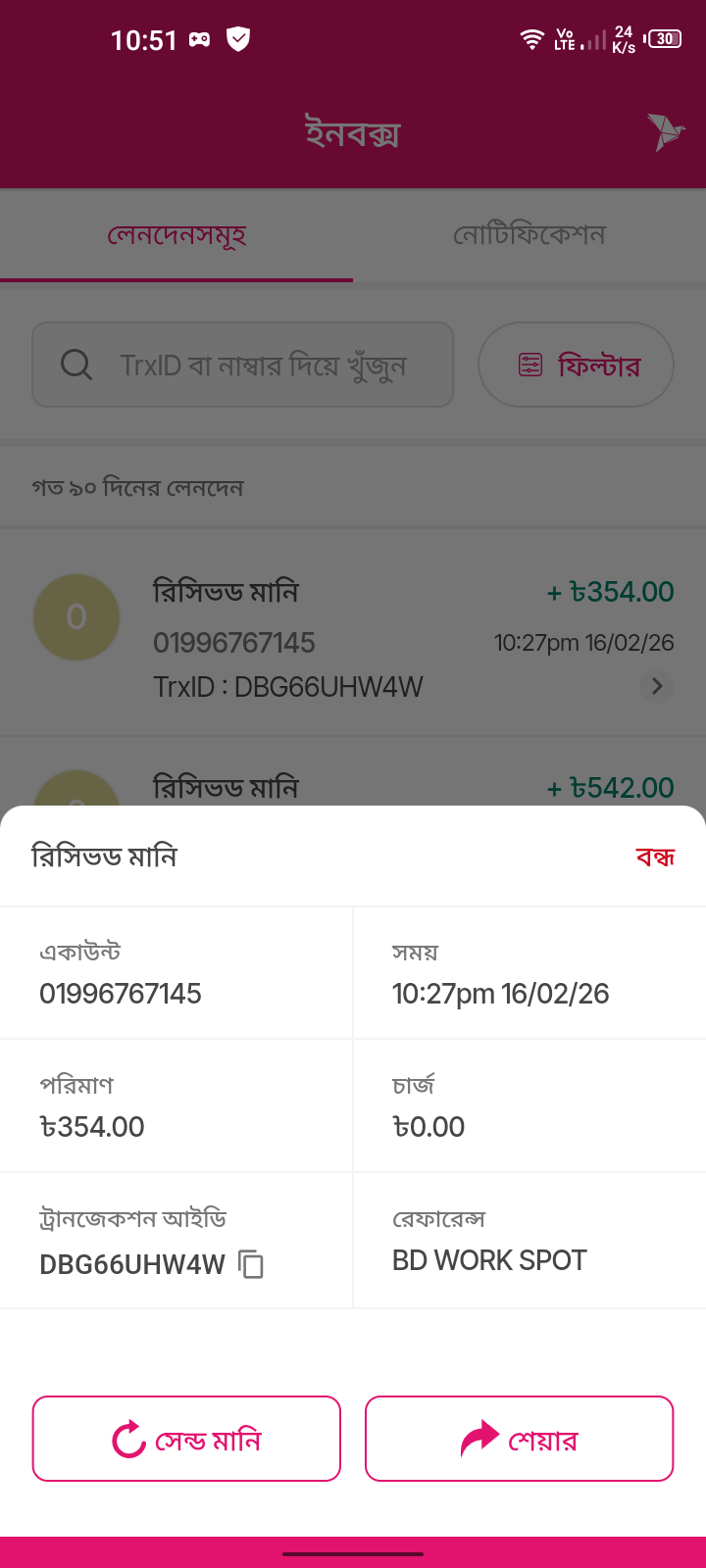 রিসিভড মানি ৳354.00